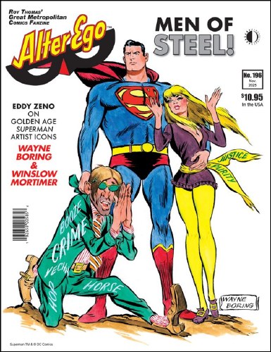 Concluding our presentation of EDDY ZENO’s book on the early SUPERMAN artists begun in Alter Ego #193—with a focus on style-setting WAYNE BORING and classic cover illustrator WINSLOW MORTIMER! Featuring a fabulous previously unprinted cover by BORING! Also—FCA (Fawcett Collectors of America) and MICHAEL T. GILBERT in Mr. Monster’s Comic Crypt! Edited by ROY THOMAS.