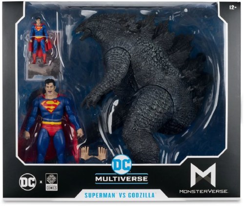 The Man of Steel faces off against Godzilla! This DC Multiverse Superman vs. Godzilla Megafig Justice League vs. Godzilla vs. Kong Action Figure 2-Pack features a 7-inch Superman action figure with a 12-inch tall Godzilla Megafig figure. As an added bonus, a 3-inch Superman figure is included! Also included is 2x alternate hands for Superman, a figure display base and a collectible art card with character art on the front, and character biography on the back.