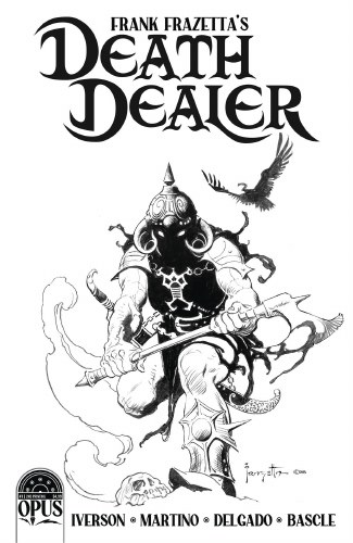 Frank Frazetta's legendary creation DEATH DEALER returns to life in collaboration with Frazetta Girls! Mitch Iverson (DOTA: Dragon's Blood), Stefano Martino (Stranger Things) and Luis Antonio Delgado (TMNT) bring you the first salvo in a major launch of new, related titles featuring characters envisioned by the Godfather of fantasy art! This special second printing is limited to 5,000 copies and features a rarely seen ink drawing of the Death Dealer by the creator himself!