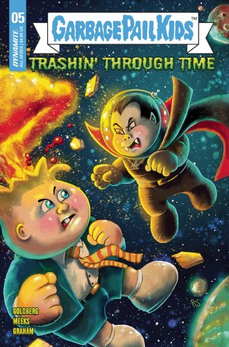 The insane minds of Adam F. Goldberg, Hans Rodionoff and Jeff Zapata have joined forces again to bring you the Garbage Pail Kids as youve never seen them before. Dynamite Entertainment and this incredible trio of creators proudly presents give you the continuing origin of the Garbage Pail Kids! Our heroes have been transported through time to the 1980s where the Garbage Pail Kids rule the world. Thats right, Garbage Pail Kids are the dominant species on earth, and normal humans have been subjugated and are forced to live as outcasts from society. Its Planet of the Garbage Pail Kids we continue Trashin Through Time!! Issue #5: It all ends here! Adam Bomb and the Kommandos are cornered by a zombie horde and theres no way out. That is, until they discover that Dead Ted can speak zombie! The GPK zombies form an alliance with our heroes to take down Nasty Nick. Our heroes then learn a shocking twist and you have to see it to believe it! Featuring 4 incredible covers by Jeff Zapata, Tom Bunk, Robert Jimenez and a classic GPK Trading Card image! Plus: Each issue is polybagged with a special GPK Trading Card!