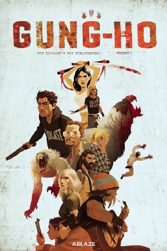 : If you like THE WALKING DEAD, you'll love GUNG-HO! In the near future, the 'White Plague' has almost completely decimated humanity, and civilization is only a sweet memory. The world as a whole has become a danger zone, where survival is only possible within towns or fortified villages. Enter orphaned brothers Zack and Archer Goodwoody, troublemaking teens who have just arrived at Fort Apache, and about to learn the hard rules of integration into the colony. Outside the walls lies a hostile and deadly environment, but inside is also a dangerous place, as the boys are about to find out. Creators Benjamin von Eckartsberg and Thomas von Kummant deliver a creative and visual tour de force with jaw-dropping artwork that will transport you to a brand new post-apocalyptic world where the tension is palpable, and the wrong move will get you killed...or worse. GUNG-HO Volume 1 collects the first two storylines of the critically acclaimed series 'Black Sheep' and 'Short Circuit', along with a bonus section including cover gallery, sketches, character art, interviews and other behind-the-scenes material!