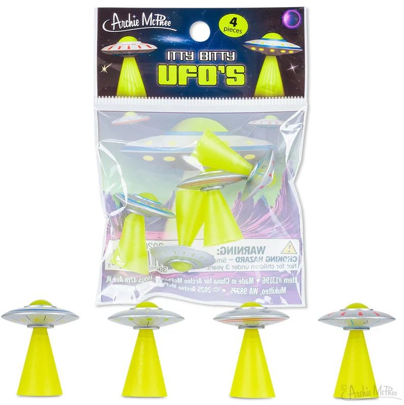 Itty Bitty UFO's can only abduct insects and tiny fish. The truth is not only out there, but also much smaller than we imagined. This set of four different UFO's, 1-1/4" tall, is made of soft vinyl. Each UFO has its own unique pattern and a mysterious beam emanating from its base, serving as a stand. The purpose of that beam is unknown. It could be to keep the UFO aloft, a tractor beam to abduct subjects for experimentation, or some sort of hypnotic suggestion to buy more Itty Bitty UFO's.