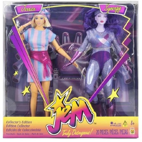 Get ready to hit center stage with this Exclusive Jem and the Holograms Collector's Edition 2-Pack, starring Jerrica Benton and her legendary AI companion Synergy in their most dazzling forms yet. This collector-grade set brings together two fully articulated 12-inch figures, outfitted in screen-accurate styles and packaged with a stage-ready lineup of accessories. Jerrica is fully poseable, dressed in her classic pastel-striped mini dress with hot pink glitter belt, features bright blonde bobbed hair, and her signature JemStar earrings. Synergy is fully poseable and appears in her striking lavender-toned bodysuit with shimmering metallic and metallic accents, styled with voluminous purple curls and futuristic flair. Each doll includes a themed microphone stand that doubles as a doll stand. With a push on the button on the base, hear the original Jem theme song-bringing the show to life on your shelf. This 2-pack comes showcased in a special edition collector's window box, this set is ready to shine in or out of the box. Truly Outrageous! Whether you're reliving your 80s obsession or starting a new one, this set delivers the sparkle, nostalgia, and pop power only Jem can bring.