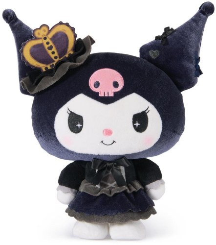 Celebrate 20 years of Kuromi with GUND! This rebellious rabbit may look tough, but she`s a big softie as a 9.5 huggable plush. Kuromi rocks her signature punk style with a cute black and gray outfit, wearing a skirt made from soft ruffled layers of black plush and gray icy velour. She also features a black satin ribbon bow tied around her neck and smaller matching bows on her ear, complemented by a black embroidered heart and her iconic pink skull clip. Kuromi stands upright with sturdy feet that keep her balanced, ready to stand out in any kawaii toy collection or cause mischief for My Melody. With rosy cheeks and a twinkle in her eye, this unique commemorative plush makes an exciting gift for any Hello Kitty or pop culture fan. Complete your Sanrio collection and celebrate 20 years of the icon with this adorable plush toy!