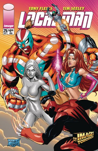 NEW STORY ARC IMAGES OF TOMORROW! Just as the Image Comics line did back in 1995, LOCAL MAN jumps ahead a full year to give you a glimpse of what the future brings, from issue 13...to 25!Third Gen is back with a vengeance! Their first mission? Bring down the reckless young superheroes of Fourth Gen! But will Local Man side with the Zoomers? Or will he help take them down in exchange for getting back the shield and uniform of...CROSSJACK?!The past, present, and future of the Image Universe collide hard in LOCAL MAN #25! On the flip! A corporate retreat at Third Gen HQ leads to...beach volleyball?