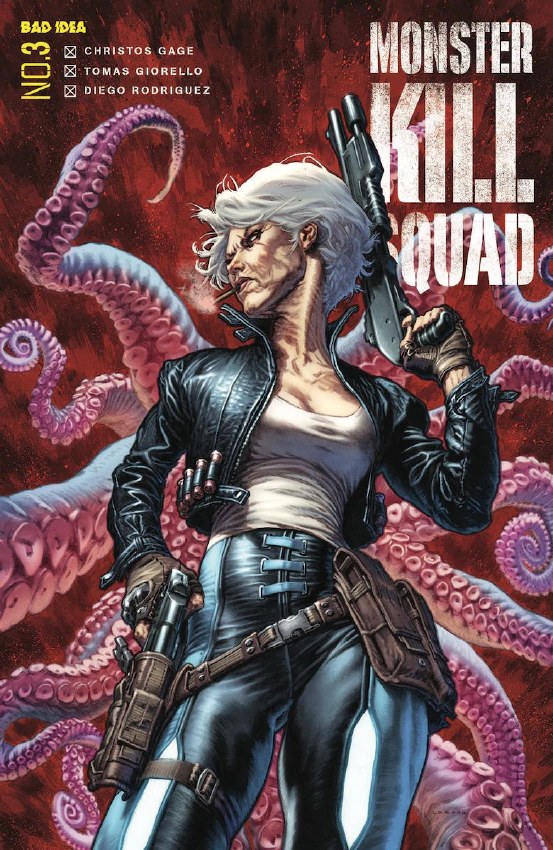 Once upon a time, monster attacks were rare. A forest witch might murder a few hikers, a killer clown might eat a few children, or a malevolent ghost might drive a young couple insane just for the hell of it. But these events were scarce, easily covered up, and soon faded into campfire stories good for a laugh. But no one's laughing now. Over the past 90 days, cryptozoological attacks have increased a hundredfold, and the arcane has become everyday. Monsters of every shape and size strike at will, and the good, taxpaying folks of the US of A have had enough of this nonsense. Enter: THE MONSTER KILL SQUAD. A Government Unit of the most dangerous motherfuckers on the planet, the deadliest folks alive are here to put a bullet in the brain of everything that walks, crawls, flies, or hides in shadows. And if it doesn't have a brain, all the better — we've got a gun for that, too. Witches and wraiths. Demons and deadites. Goblins and ghosts. There have always been monsters. Now there are monster killers, and the MKS will kill it, and kill it good.