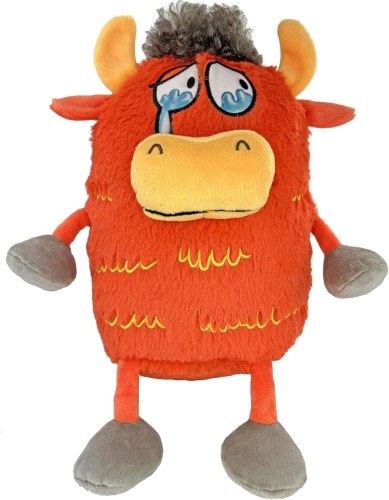 Moo Hoo Milton has fluffy burnt orange fabric, soft yellow horns, a wispy tail, and embroidered appliqued eyes brimming with tears.