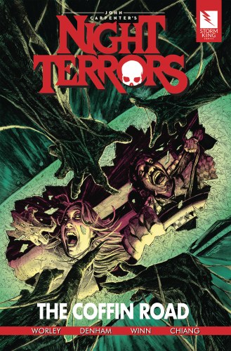 On a haunted road in the backwoods of New England, a luckless recovery driver finds himself helping a distraught young woman pursued by a malevolent specter. Together, they must unravel the mystery of the so-called 'Coffin Road' and escape before dawn, or else remain trapped here forever. Writer Alec Worley (Judge Dredd, Warhammer, Star Wars) along with artist Trevor Denham (Calibur Presents, Tomb of Terror, Split Lip) and colorist Ryan Winn (Spawn, Batman, Gods and Gears) take you on a terrifying journey down THE COFFIN ROAD, the SIXTH story in Storm King Comics' anthology series, John Carpenter's Night Terrors.