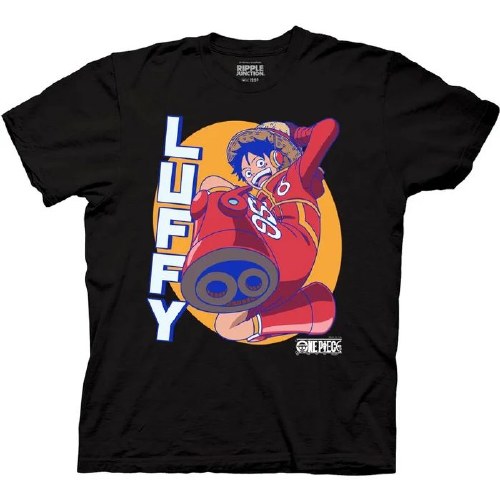 This Tshirt features the Iconic Luffy for the sailing epic Manga and anime in his suit for the much moved Egghead Island Arc.