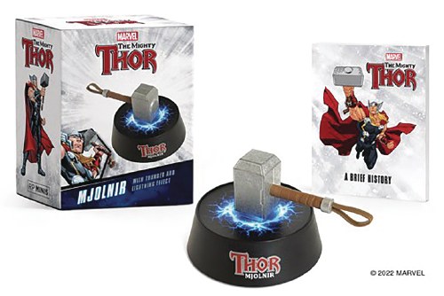 Wield the power of Thor with this officially licensed mini replica of the legendary Mjolnir! This mini metal Mjolnir makes thunder sounds and a lightning effect when it hits the base (which doubles as a deluxe display stand for your home or office) and includes a 48-page mini book on Thor's comic book origins, greatest adventures (and adversaries), most epic battles, and ill-fated romances -all complemented with classic comic book art.