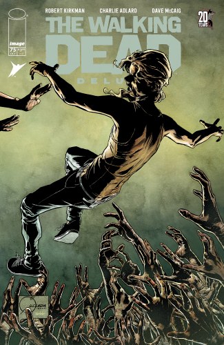 'THE WALKING DEAD DELUXE CELEBRATES 75 ISSUES! A domestic dispute forces Rick to intervene, revealing to the entire town he still carries his gun, a direct violation of the laws of Alexandria.'