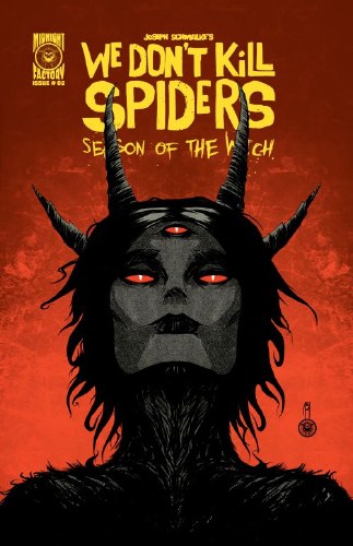 Midnight Factory Presents: We Don't Kill Spiders: Season Of The Witch. Set during the early Viking age, Revna, a Necromantic Witch, and Bjorn, a Berserker detective, hunt a dark god, known only as the Black Goat, and her bloodthirsty clan of followers. As this malevolent being’s intentions are revealed, her influence has sparked a violent feud between two villages, leaving a trail of chaos and corruption in its wake. This second chapter is written and illustrated by Joseph Schmalke (Seven Years in Darkness, The Electric Black, and Cherry Blackbird).
